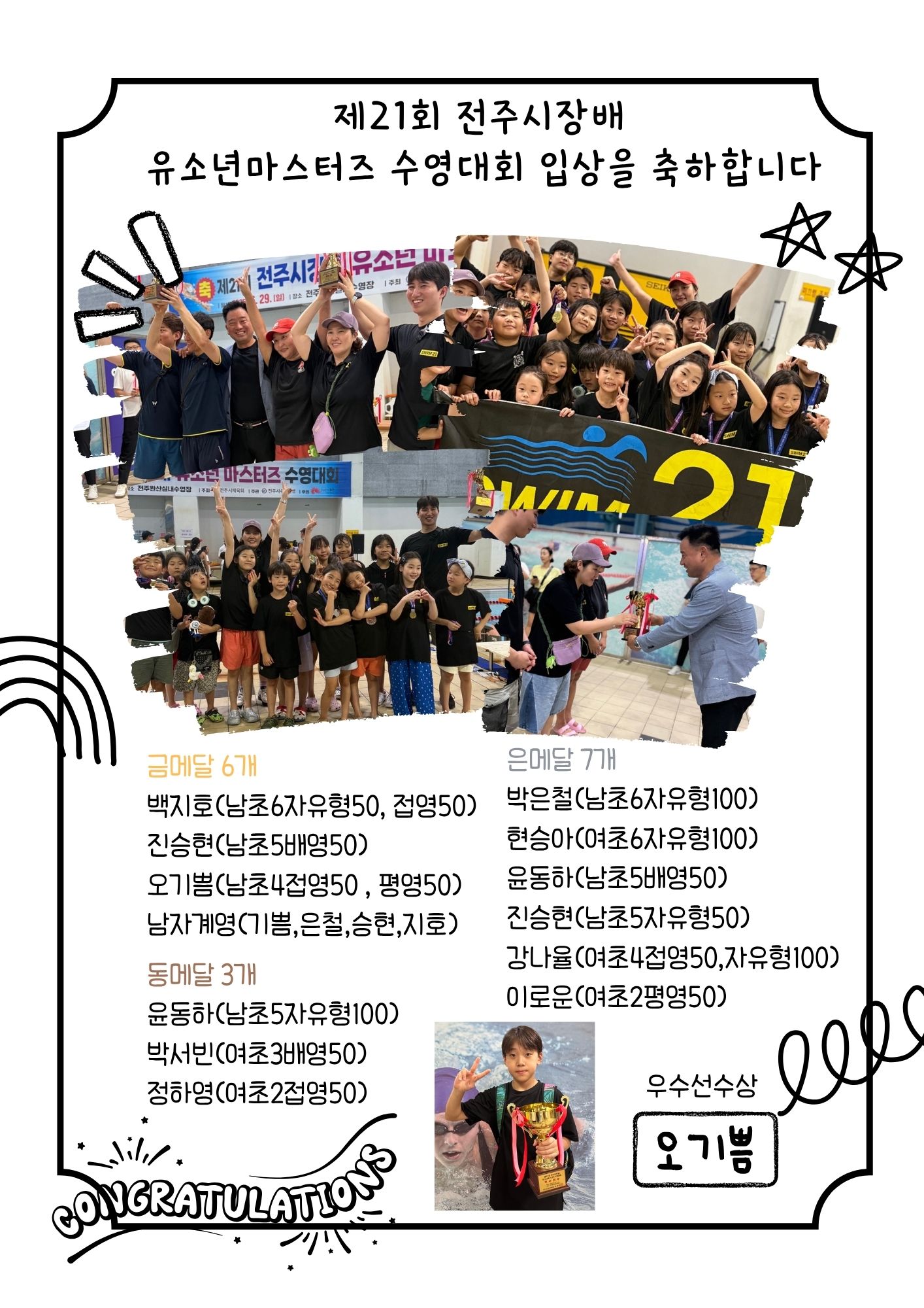 현승아 (여초6학년 자유형 100M), 강나율 (여초4학년 접영 50M, 자유형 100M), 이로운 (여초2학년 평영 50M)