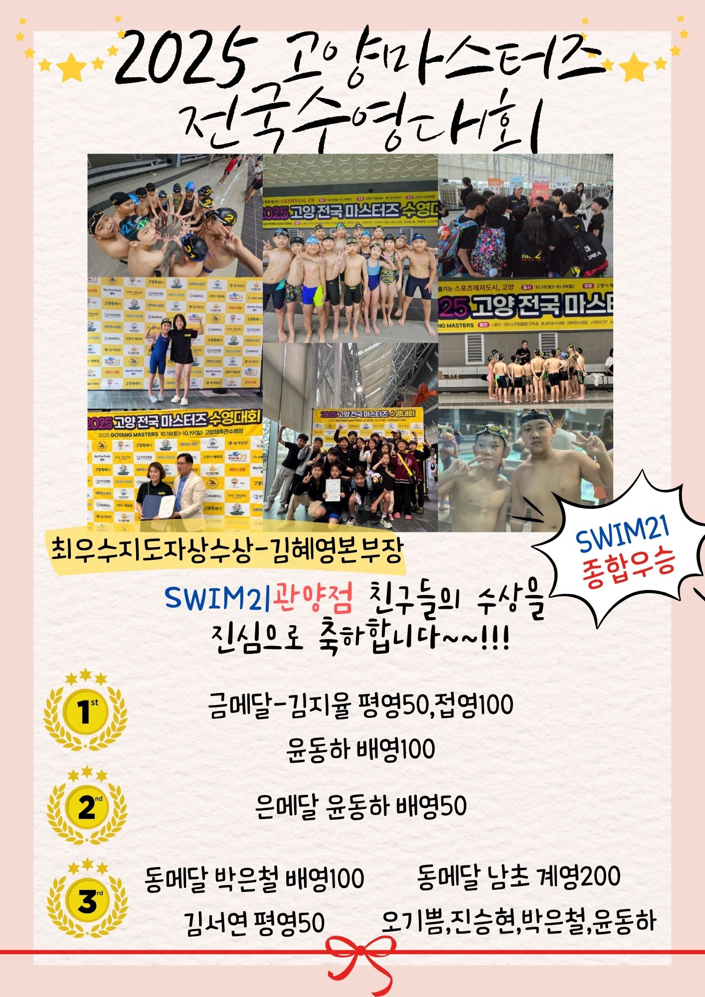 동메달 : 박은철(샘모루초 6학년 남자 배영 100M) / 김서연(관양초 4학년 여자 평영 50M)