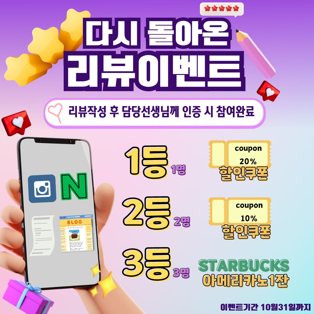 리뷰이벤트가 다시 돌아왔어요~~~!! 10월 한 달간 진행되며 11월 초 추첨을통해
