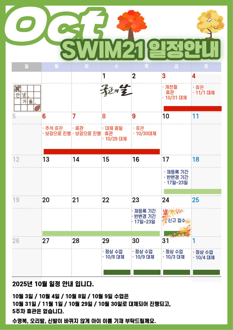 스윔21 관양점 추석 휴관 안내 및 수업 일정 안내
