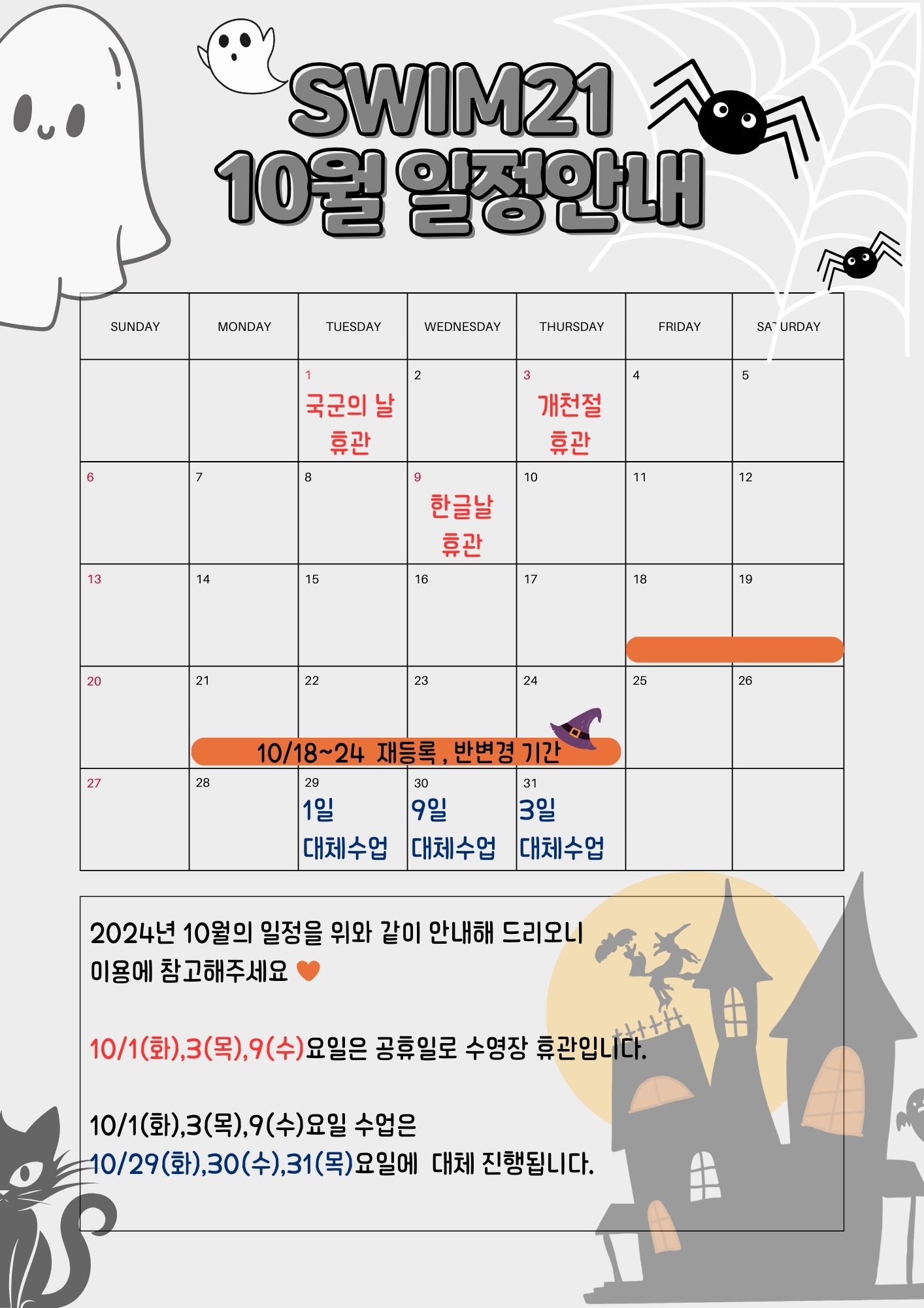 10월 1일(화), 3일(목), 9일(수)요일은 공휴일로 정규수업 진행하지않습니다!
